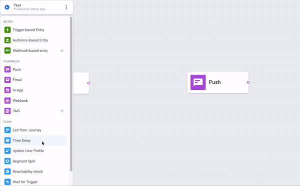 Section titled “Если push-уведомление продолжает поток коммуникации”Вставьте элемент Time Delay между предшествующими элементами коммуникации и push-уведомлением, которое вы хотите запланировать: