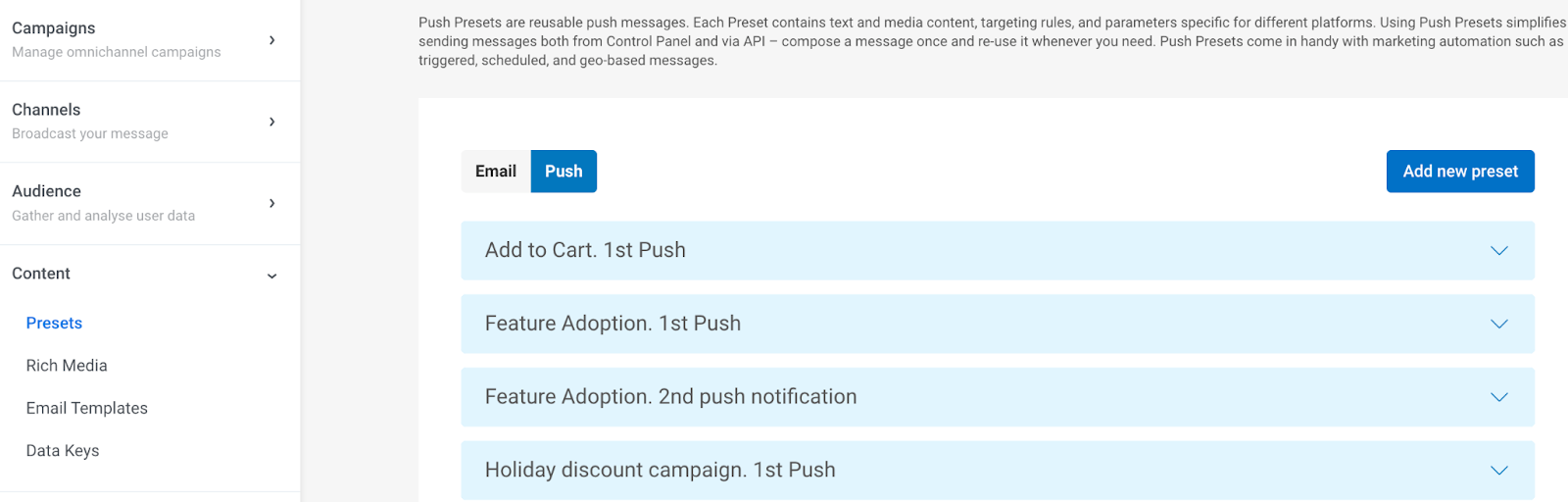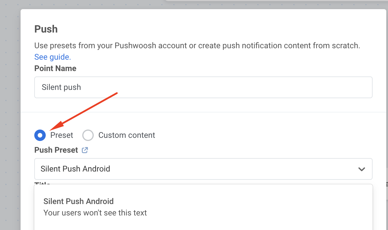 Section titled “Устаревшая форма пресета для push-уведомлений”Чтобы отправить тихое push-уведомление, перейдите в Контент > Пресеты и добавьте новый Preset.
