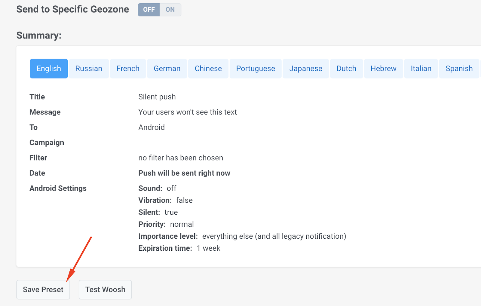 Устаревшая форма пресета для push-уведомлений