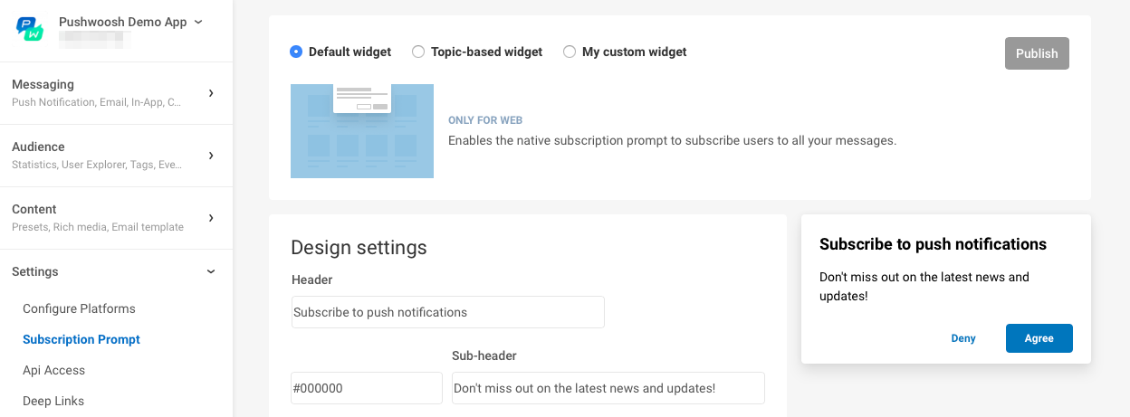 Section titled “Создайте виджет по умолчанию”Чтобы настроить виджет подписки по умолчанию, перейдите в раздел Subscription prompt в вашем Control Panel и установите соответствующий флажок.