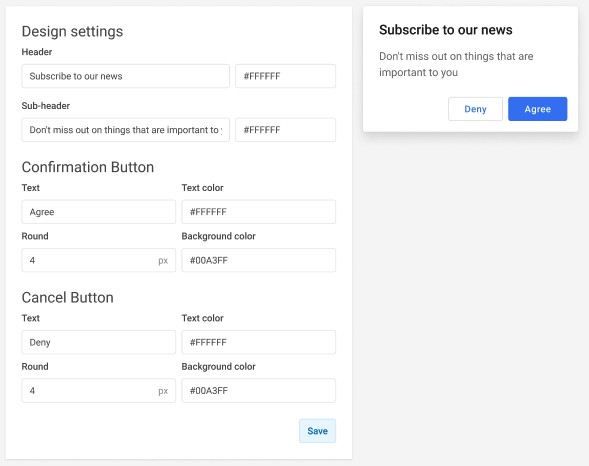 Section titled “Как это работает”Виджет по умолчанию содержит простой текст, объясняющий ценность push-уведомлений, и две кнопки для согласия или отказа от их получения. Когда пользователь нажимает кнопку подтверждения, запускается нативный запрос на подписку от браузера.