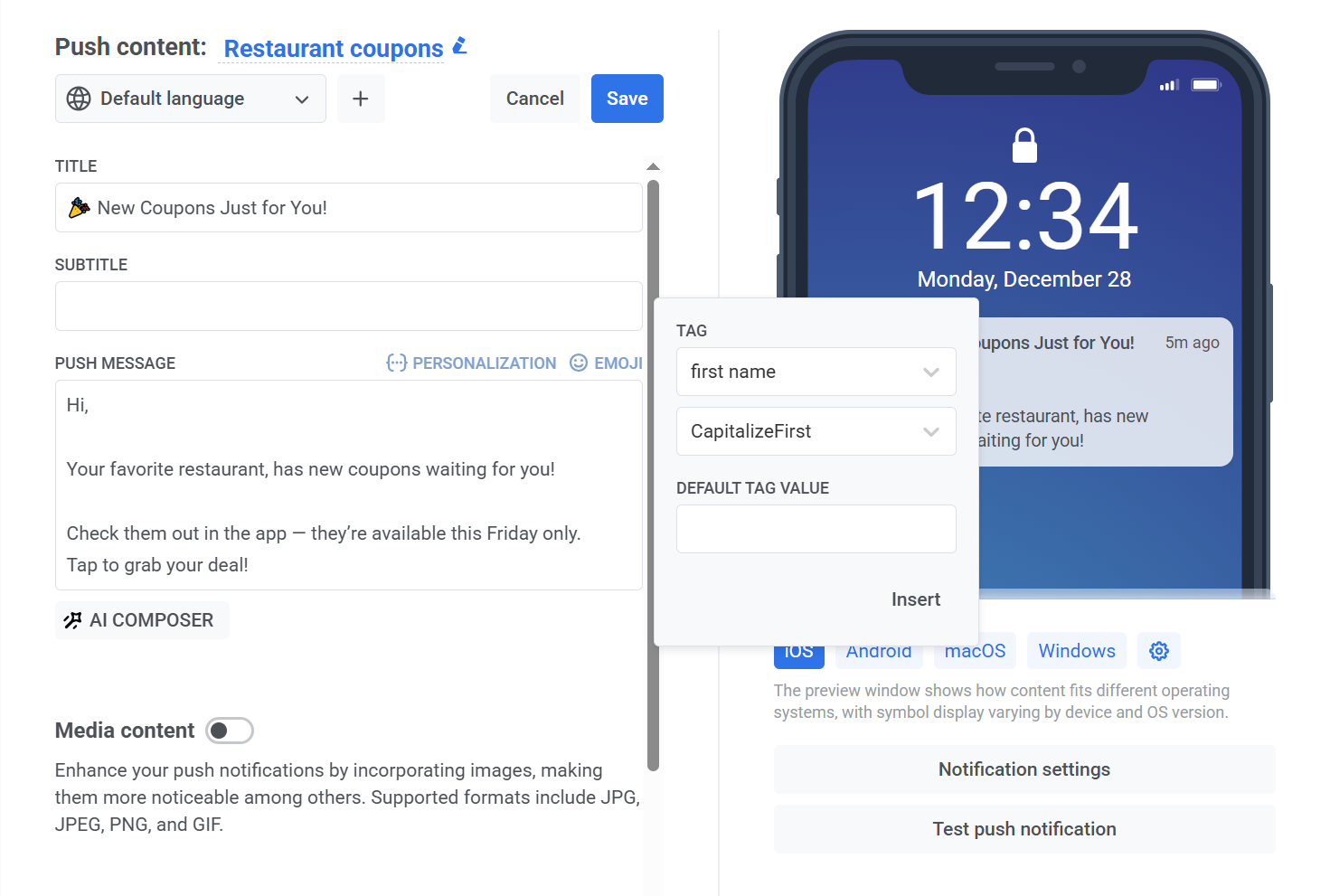 В нашем случае это Tag «Имя», чтобы каждый пользователь получил персонализированное Push-уведомление.