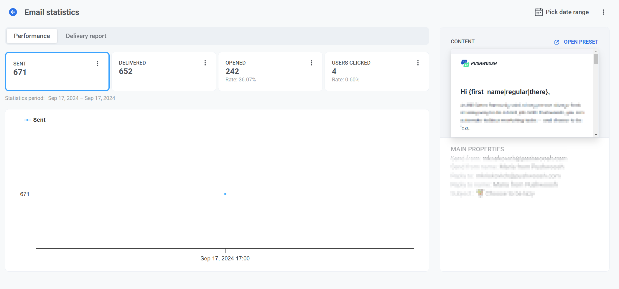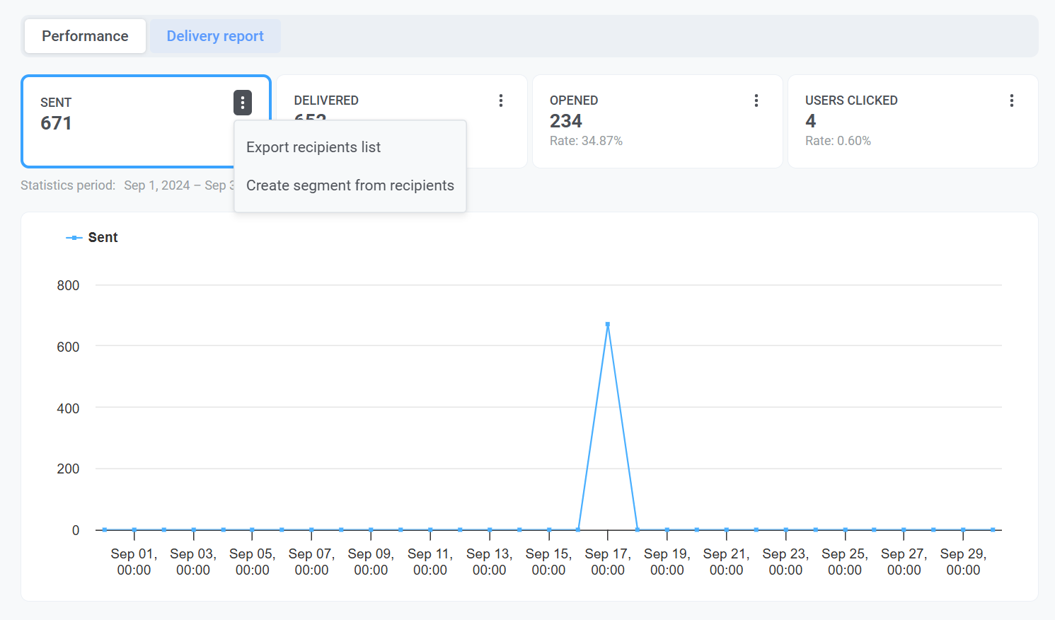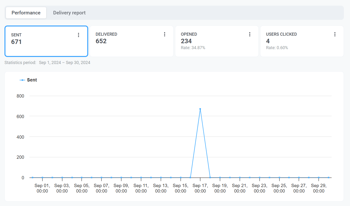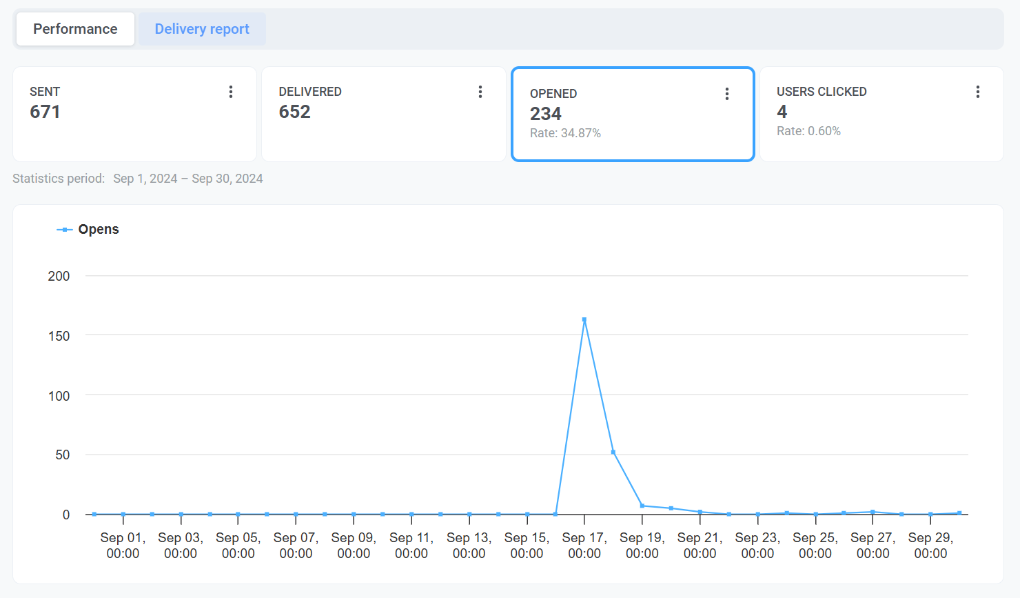 - Вкладка Performance: Отображает такие важные метрики, как Sent, Delivered, Opened и Users clicked. Здесь также есть динамический график, который показывает тенденции для каждой метрики с течением времени, что позволяет отслеживать эффективность кампании в определенном диапазоне дат и получать более глубокое понимание ваших email-кампаний.
