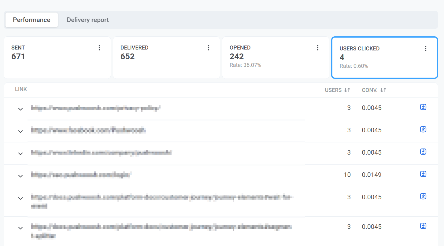 Section titled “Users clicked”Метрика Users clicked дает ценную информацию о том, как получатели взаимодействуют со ссылками в ваших сообщениях. Анализируя данные о кликах, вы можете оценить вовлеченность пользователей, определить наиболее эффективные элементы призыва к действию (CTA) и оптимизировать контент сообщений для улучшения результатов.