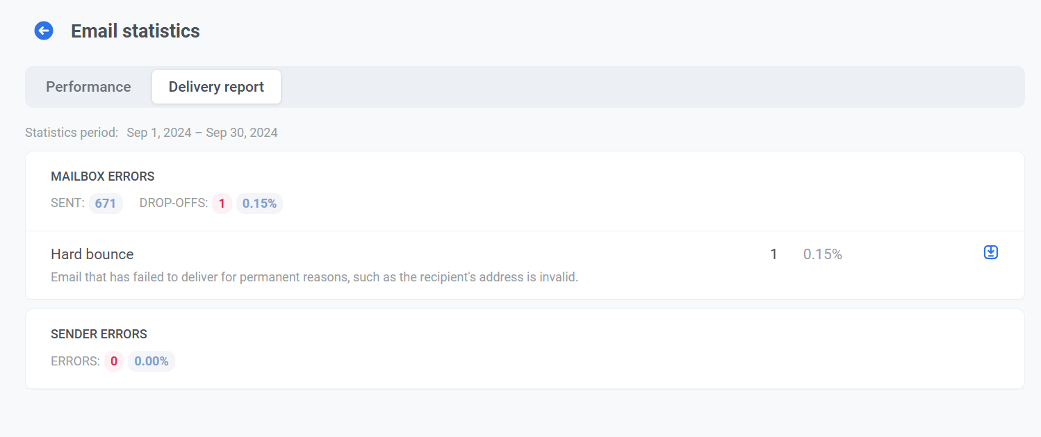 Section titled “Вкладка Delivery report”Отчет о доставке (Delivery Report) предоставляет подробную разбивку эффективности доставки email, выявляя ошибки и проблемы, возникшие в процессе доставки. Эта информация позволяет анализировать сбои, оптимизировать вашу email-стратегию и улучшать общую эффективность кампаний.