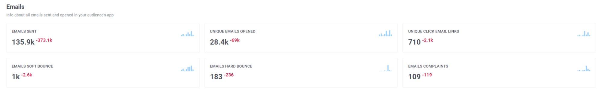 | Complaint | Количество пользователей, которые сообщили о вашем сообщении как о спаме или подали жалобы своему провайдеру электронной почты. Жалобы могут привести к ограничениям ваших возможностей по отправке сообщений со стороны email-провайдеров и клиентов. | Расследуйте жалобы и убедитесь, что ваш контент релевантен и соответствует лучшим практикам email-маркетинга, чтобы избежать пометки как спам. |