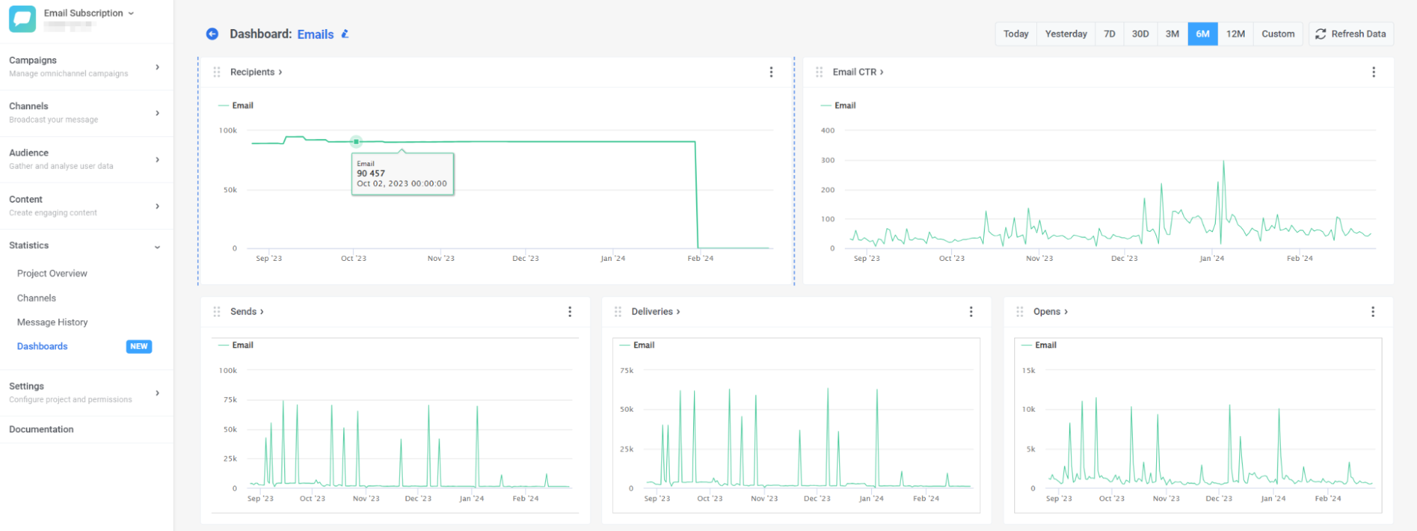 Section titled “Project overview”Чтобы оценить общую эффективность ваших email-кампаний, перейдите в Statistics > Project Overview. Здесь вы можете просмотреть общее количество отправленных, доставленных и открытых писем за выбранный период, что позволяет сравнить эффективность email с другими каналами.