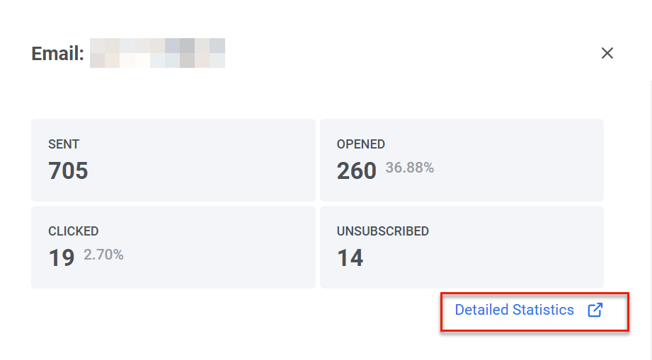 Section titled “Подробная статистика по email”Чтобы просмотреть подробную статистику по email-сообщению, нажмите Detailed Statistics в элементе email в Journey. Или получите к ней доступ через Statistics → Message history. Найдите нужное сообщение и кликните по нему.