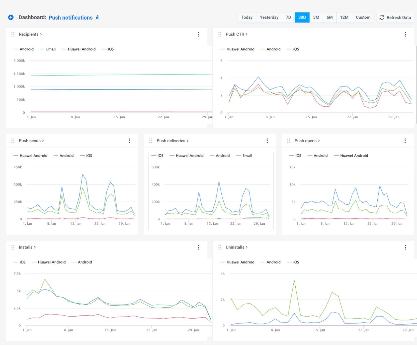 Дашборд предоставляет исчерпывающую информацию об общей эффективности push-уведомлений, включая такие метрики, как: