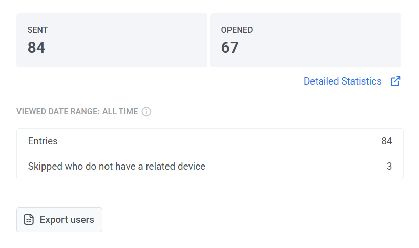 Section titled “Экспорт списка получателей”Вы можете загрузить подробные данные о получателях вашей push-кампании. Эти данные можно использовать для дальнейшего анализа или сегментации для оптимизации будущих кампаний.