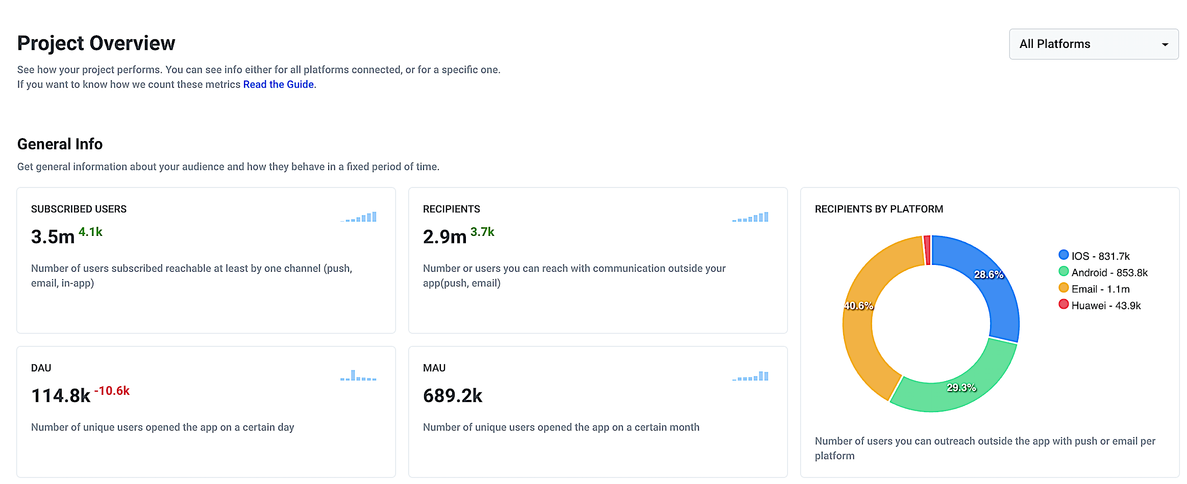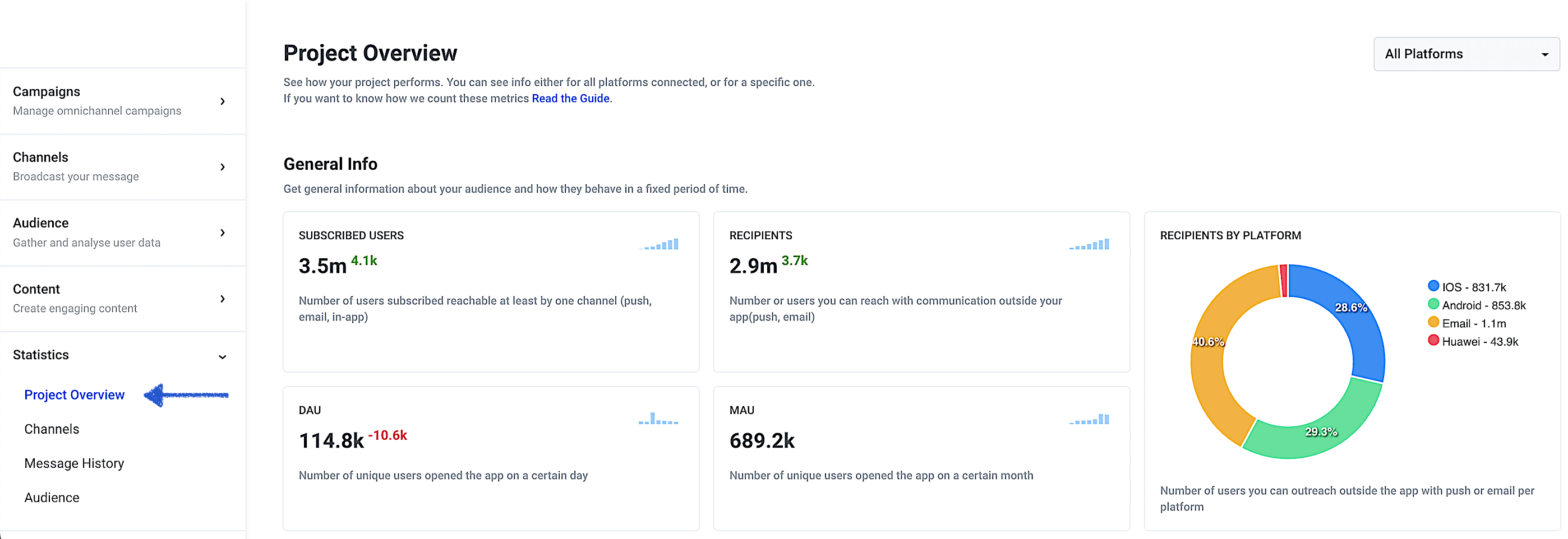 Оцените эффективность ваших маркетинговых кампаний с помощью исчерпывающей статистики по каждому из ваших проектов! На странице Project Overview вы получите самую актуальную статистику, содержащую основные метрики по Audience и уровню вовлеченности вашего проекта.
