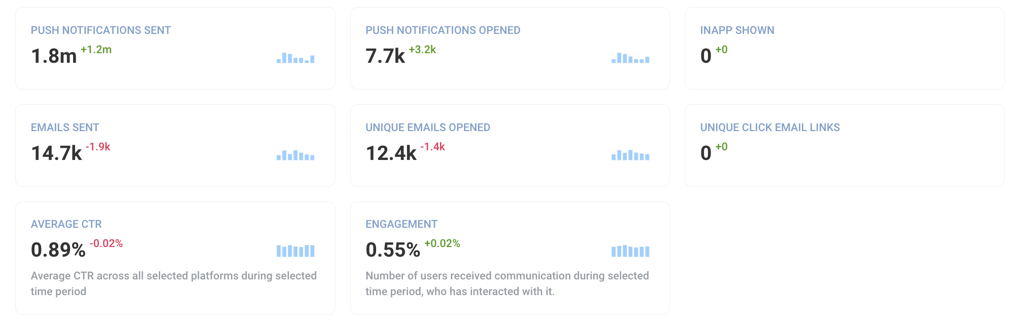 Section titled “Emails Sent”Общее количество Email, отправленных вашей Audience за выбранный период, и динамика для канала Email.