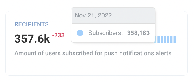 Каждая метрика в разделе «Общая информация» отображает данные за предыдущий день и динамику по сравнению с позавчерашним днем. Например, на изображении ниже видно, что вчера число Recipients уменьшилось на 233 по сравнению с предыдущим днем. Наведите курсор на синюю полосу рядом с числом, чтобы увидеть динамику за неделю.