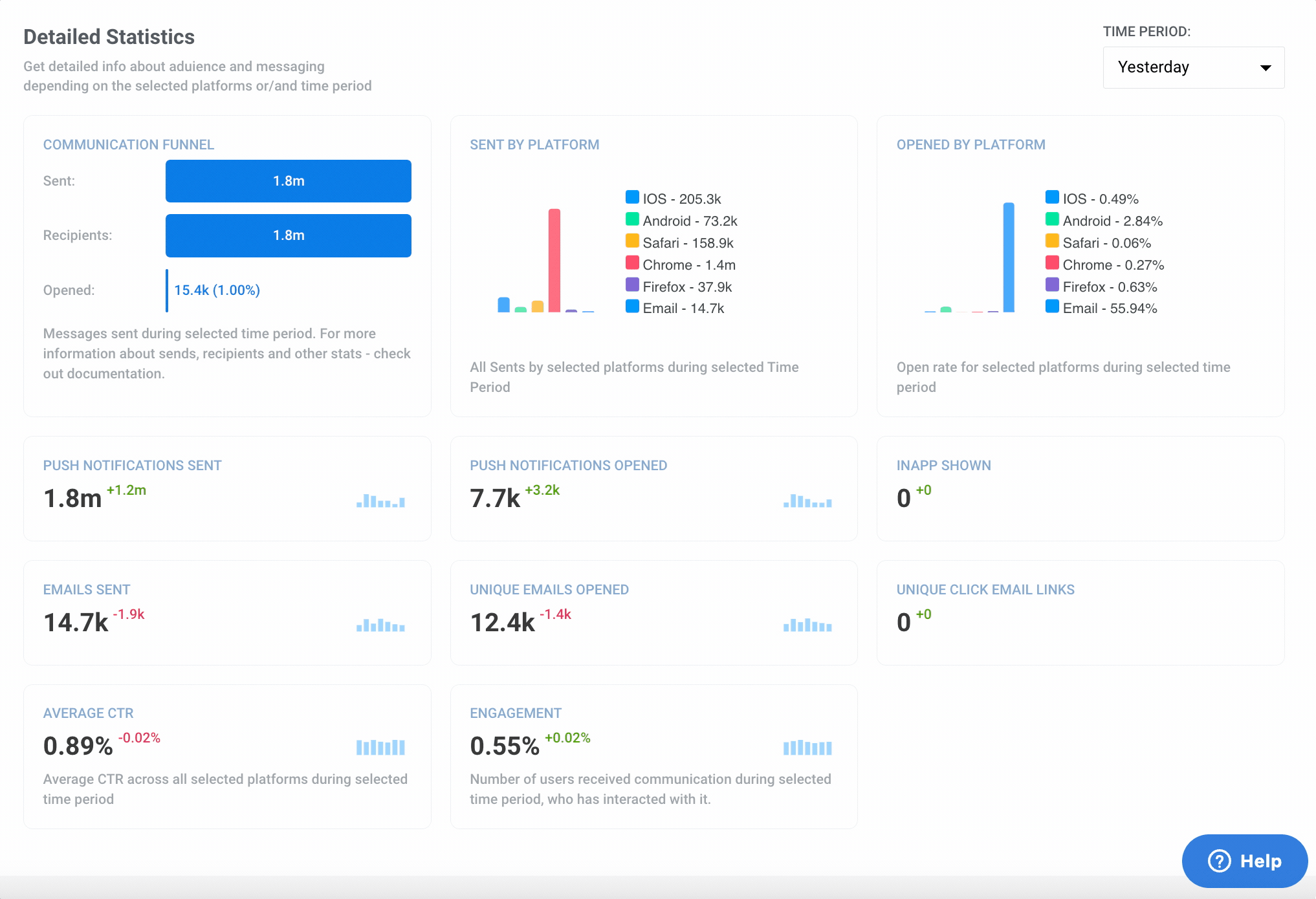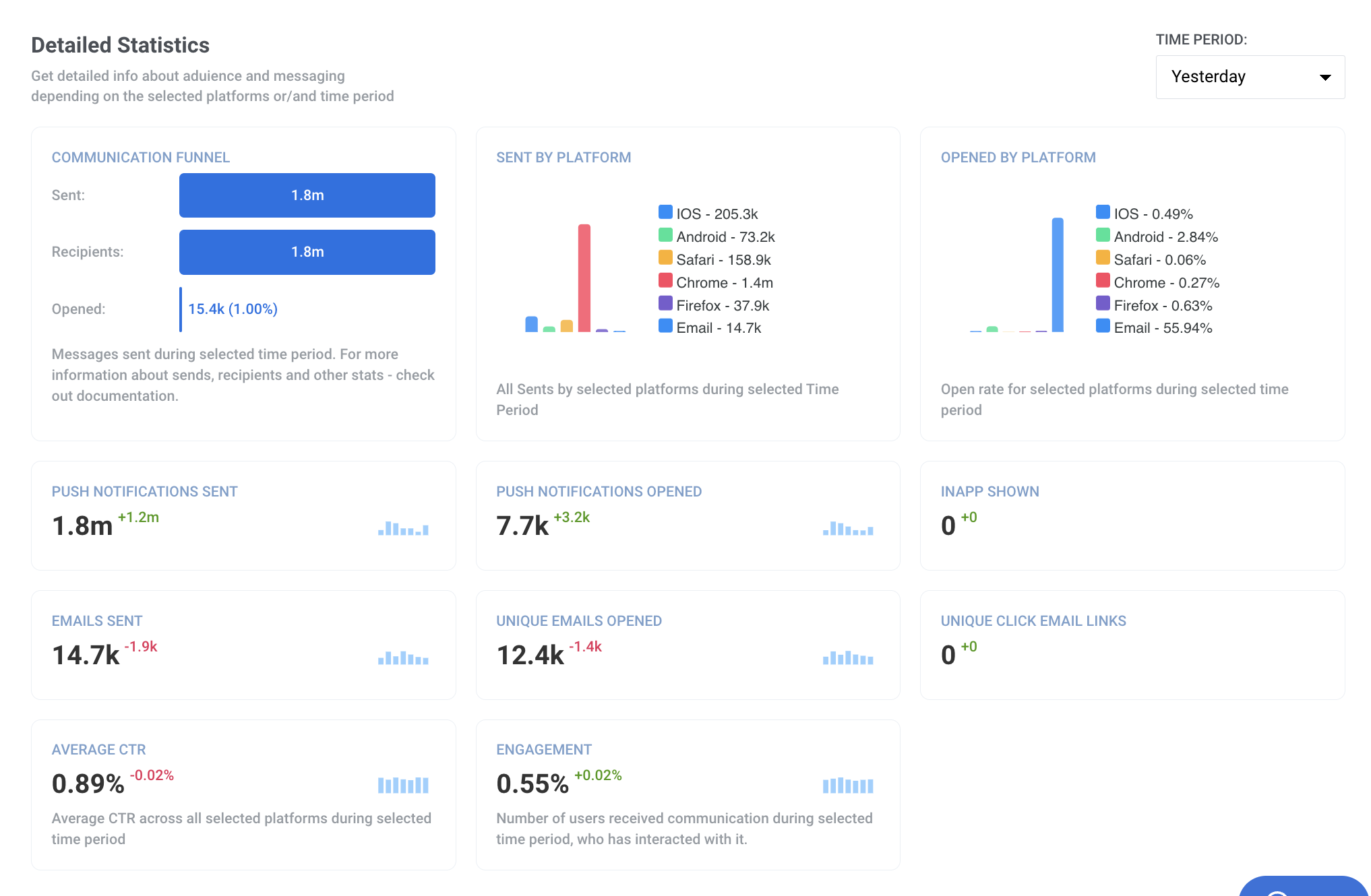 - Recipients – размер целевой аудитории этих сообщений, включающий только устройства с включенными push-уведомлениями или разрешенными Email.